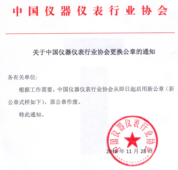 根據工作需要,中國儀器儀表行業協會從即日起啟用新公章(新公章式樣如下),原公章作廢。 特此通知。