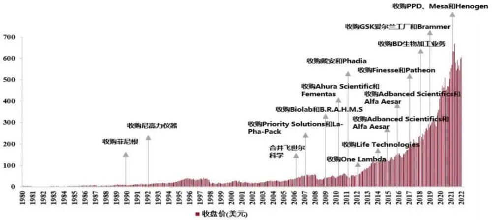 對于并購標的的選擇尤其偏愛細分龍頭。比如2011年以21億美元收購美國戴安公司,成為色譜行業領先者;2021年,174億美元收購PPD,躋身全球CRO行業TOP 5