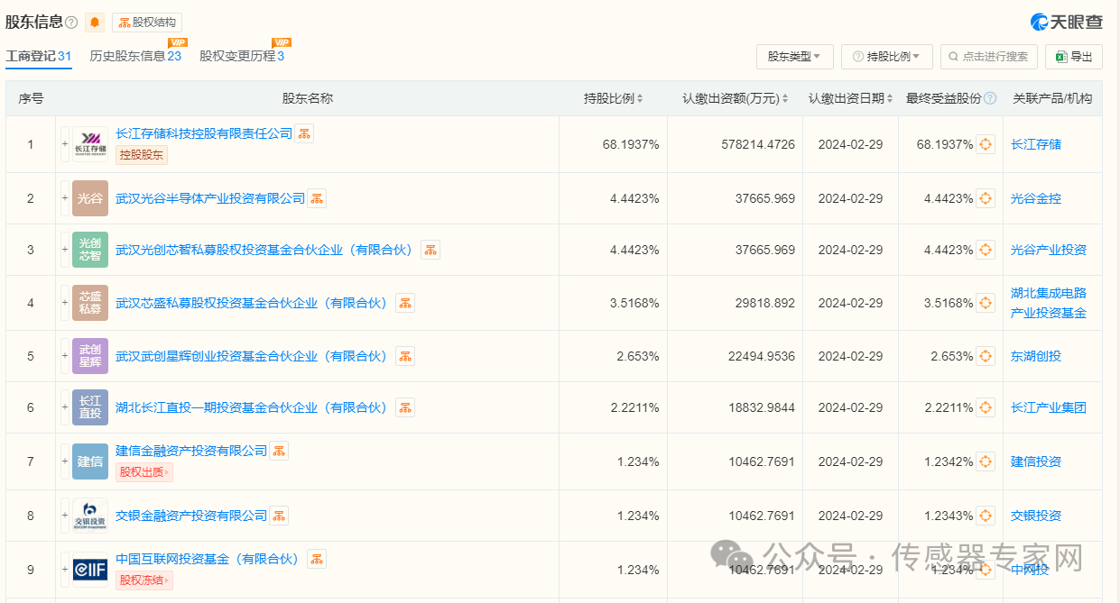 2024年2月29日,武漢新芯引入30多家投資機構(gòu),包括廈門炬達二號投資合伙企業(yè)(有限合伙),武漢金融控股,武漢光谷半導(dǎo)體產(chǎn)業(yè)投資有限公司,武漢光創(chuàng)芯智私募股權(quán)投資基金,國鑫創(chuàng)投,招銀國際,長投集團,謝諾投資,中信證券,中國農(nóng)業(yè)銀行,中銀金融,湖北高投,恒盛融通投資,建信投資,中國工商銀行,東湖創(chuàng)投,交銀金融資產(chǎn)投資有限公司,海通創(chuàng)意資本,湖北長江直投等等。目前,武漢新芯的控股股東為長江存儲, 持股超68%。