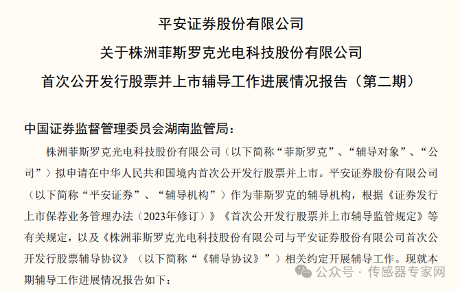 公告顯示平安證券股份有限公司已于2024年1月25日與株洲菲斯羅克光電科技股份有限公司簽訂上市輔導(dǎo)協(xié)議,截止2024年7月8日,已完成第二期輔導(dǎo)工作。