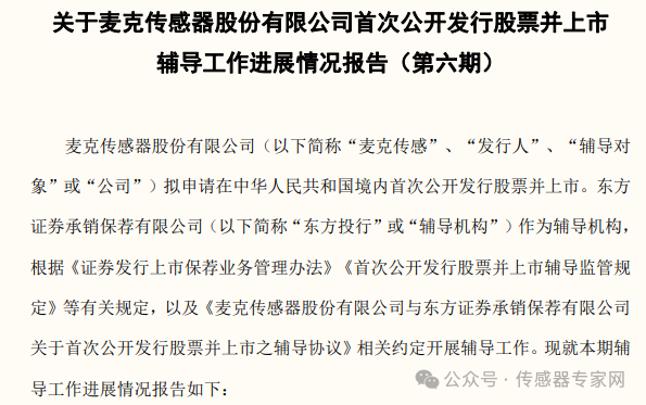 2023年1月10日,麥克傳感與東方證券簽署上市輔導(dǎo)協(xié)議,截止2024年7月10日,麥克傳感已完成第六期上市輔導(dǎo)工作。
