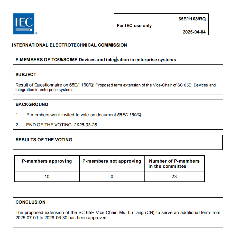 20244月,國際電工委員會企業設備與系統集成分委員會(IEC/SC65E)正式宣布,機械工業儀器儀表綜合技術經濟研究所(以下簡稱儀綜所)標準與檢測中心主任丁露博士以100%贊成率成功連任IEC/SC65E副主席,任期為202571日至2028630日。