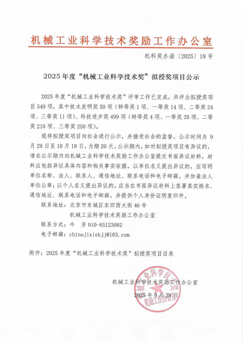現將擬授獎項目向社會進行公示,并接受社會的監督。公示時間為929日至1018日,為期20天。公示期內,如對擬授獎項目有異議的,請在公示期內向機械工業科學技術獎勵工作辦公室提交書面異議材料,材料應包括異議具體內容和相關事實依據。以單位名義提出異議的,應寫明單位名稱、法人、聯系人、通信地址、聯系電話和電子郵箱,并加蓋法人單位公章;以個人名義提出異議的,應當在書面異議材料上簽署真實姓名、通信地址、聯系電話和電子郵箱,并提供個人身份證明復印件。