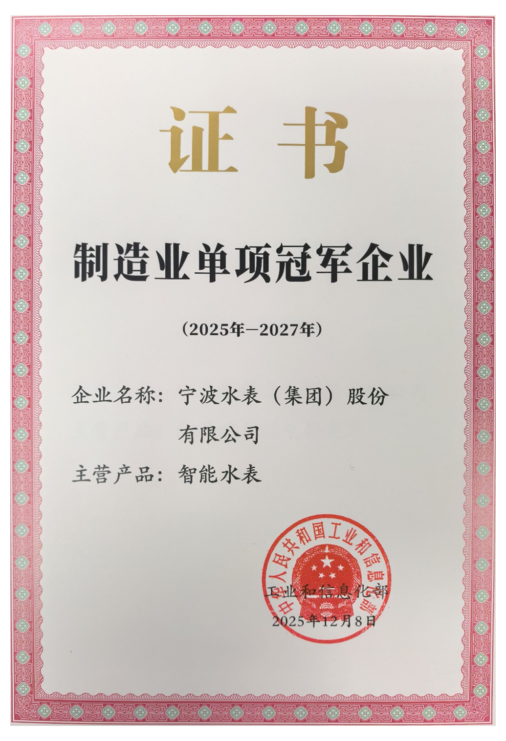 近日,工業(yè)和信息化部正式公布制造業(yè)單項(xiàng)冠軍企業(yè)復(fù)核通過名單,寧波水表(集團(tuán))股份有限公司(以下簡稱“寧水集團(tuán)”)再次榮膺國家級制造業(yè)單項(xiàng)冠軍企業(yè)稱號(hào),成為行業(yè)內(nèi)唯一蟬聯(lián)該國家級榮譽(yù)的標(biāo)桿企業(yè)。此次復(fù)核成功,不僅是對寧水集團(tuán)在智能水計(jì)量領(lǐng)域全球領(lǐng)先地位的權(quán)威認(rèn)證,更是對企業(yè)構(gòu)建并持續(xù)深化技術(shù)、制造與品牌全方位核心競爭力的國家級認(rèn)可。