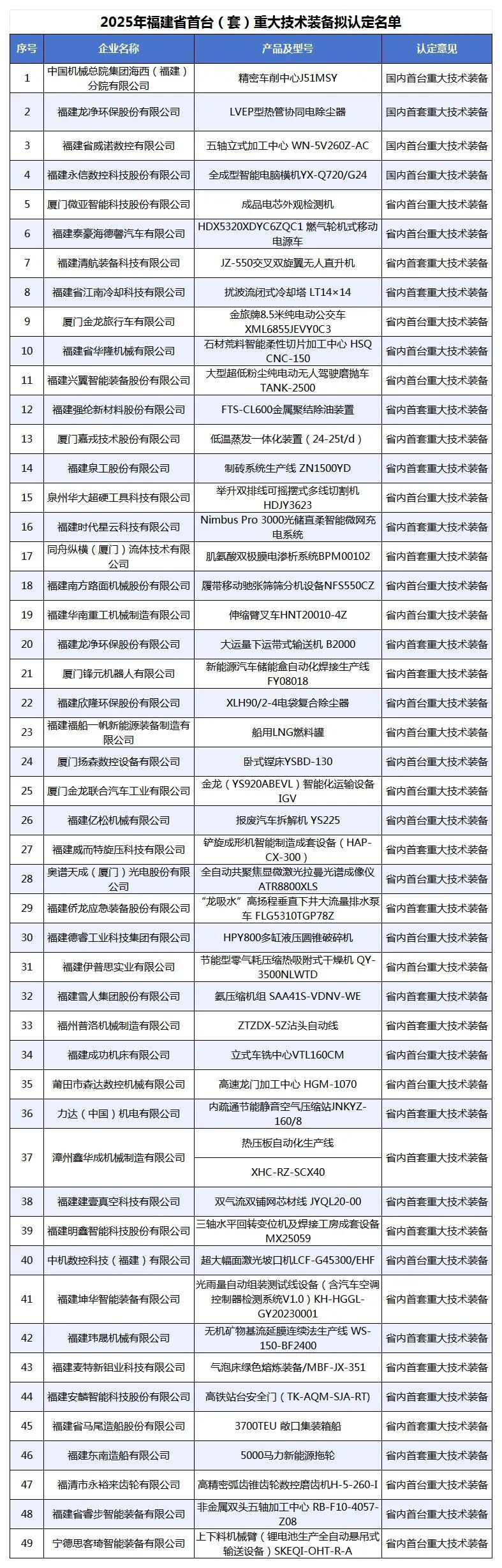 福建省工信廳公示2025年福建省首臺(tái)(套)重大技術(shù)裝備認(rèn)定名單49家企業(yè)上榜一起來(lái)看下具體名單。